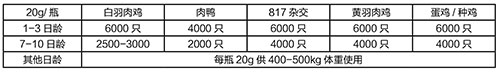 每瓶 20g 本品兑水 200-300kg 使用,连用 3-5 天。